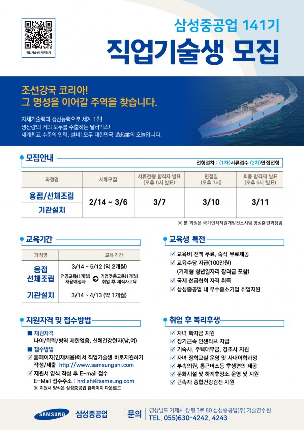 삼성중공업 141기 생산전문화 직업기술생 모집 안내