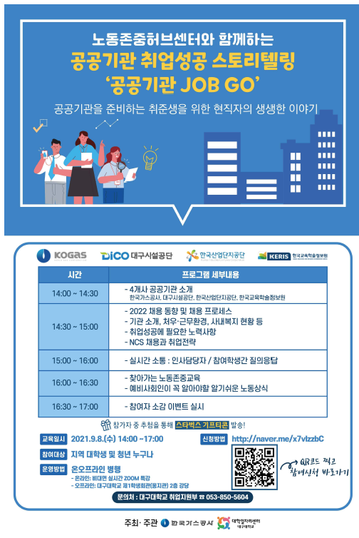 대구대학교 대학일자리센터에서 주관하는 공공기관 취업성공 스토리텔링 「공공기관 JOB GO」프로그램이 아래와 같이 진행중이오니 관심 있는 학과 및 재학생 분들의 많은 참여바랍니다.