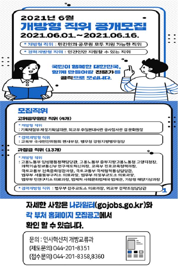 인사혁신처(중앙선발시험위원회)는 기획재정부, 외교부, 교육부, 고용노동부, 과학기술정보통신부, 국토교통부, 법무부, 법제처, 병무청, 기상청의 17개 직위에 대해 다음과 같이 공개모집하오니, 역량 있는 분들의 많은 응모를 바랍니다.