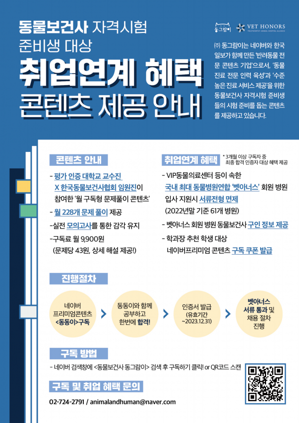 동물보건사 자격시험 준비생 대상 취업연계 혜택 콘텐츠 제공 안내 페이지 정보 작성일 관련링크 동물보건사 자격시험 준비생 대상 취업연계 혜택 콘텐츠 제공 안내 이전글 다음글 목록 본문